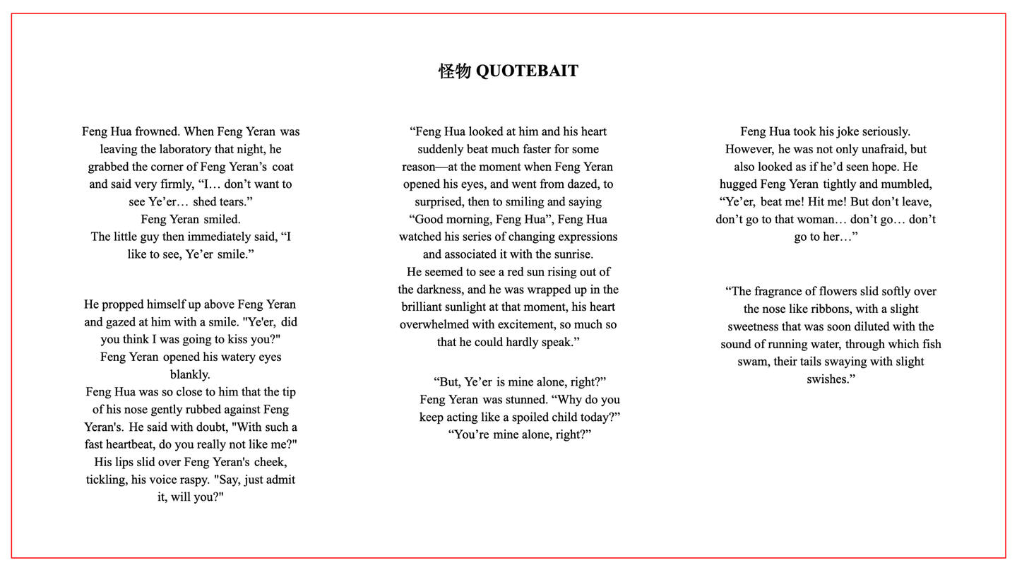 Hua Cheng smiled, too. “If you’re so concerned with who’s dead, I suggest you go kill yourself.”“I’ll tell you what it is,” he said softly. “To watch with your own eyes your beloved be trampled and ridiculed, yet be unable to do anything. That’s the worst suffering in the world.”Hua Cheng laughed. “I promise, you will not find another person who is more sincere than me in this world.”“The three of them turned their heads, and saw the single eye of that boy, so bright it pierced the soul; that battered face was both furious and sad, both joyous and wild.